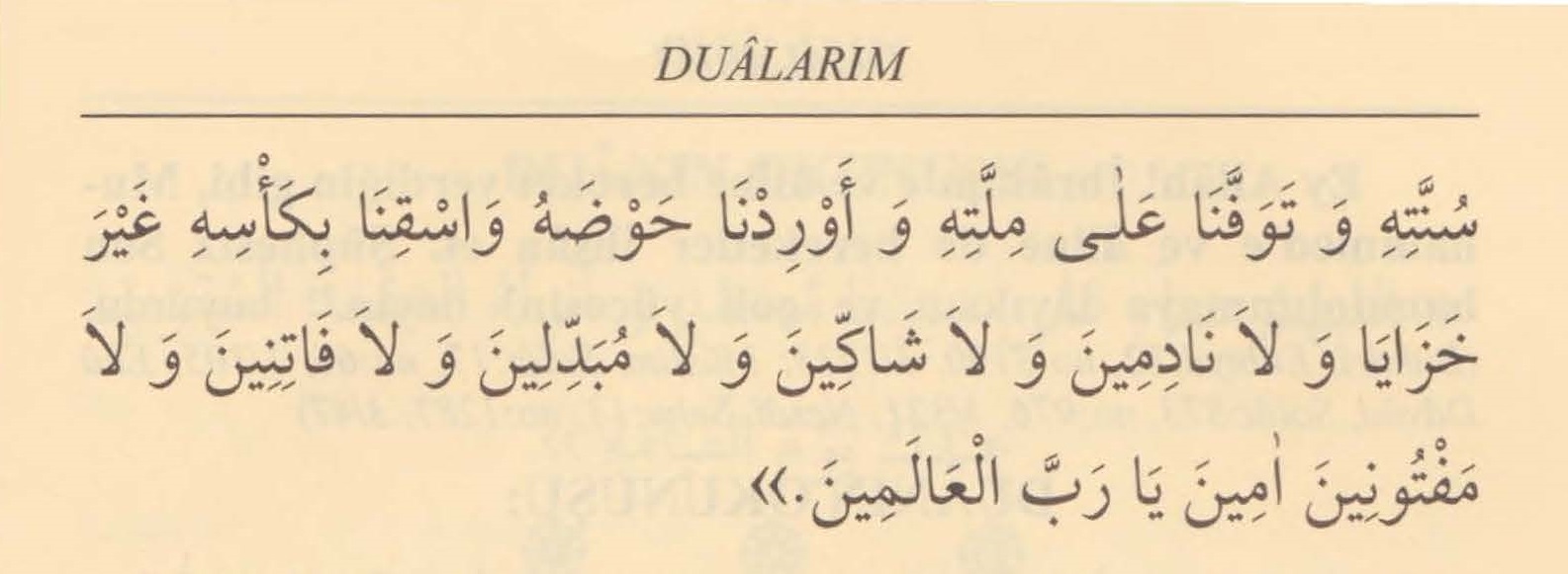 Allâhümmec-al fedâile salevâtik, ve nevâmiye berakâtik, ve şerâife zekevâtik, ve ra'feteke ve rahmeteke ve tehiyyetek, alâ Muhammedin seyyidil-mürselîn, ve imâmil-mütteqîn, ve hâteminnebiyyîn, ve rasûli rabbil-âlemîn, qâidil-hayr, ve fâtihil-birr, ve nebiyyirrahmeh, ve seyyidil-ümmeh. Allâhümmeb-ashü meqâmen mahmûdâ, tüzlifu bihî qurbeh, ve tüqirru bihî ayneh, yağbituhû bihil-evvelûne vel-âhirûn. Allâhümme a'tıhil-fadle vel-fadîleh, veşşerafe vel-vesîleh, vedderaceterrafîah, vel-menzileteşşâmihatel-münîfeh. Allâhümme a'ti seyyidenâ Muhammeden sü'leh, ve belliğhu me'mûleh, vec-alhü evvele şâfi-in ve evvele müşeffa'. Allâhümme azzım burhâneh, ve seqqil-mîzâneh, ve eblic hucceteh, verfa' fî a'lel muqarrabîne deraceteh. Allâhümmahşurnâ fî zümratih, vec-alnâ min ehli şefâ-atih, ve ahyinâ alâ sünnetih, ve teveffenâ alâ milletih, ve evridnâ havdah, vesqinâ bi ke'sih, ğayra hazâyâ ve lâ nâdimîn, ve lâ şâkkîne ve lâ mübeddilîn, ve lâ fâtinîne ve lâ meftûnîn. Âmîn. Yâ rabbel-âlemîn.