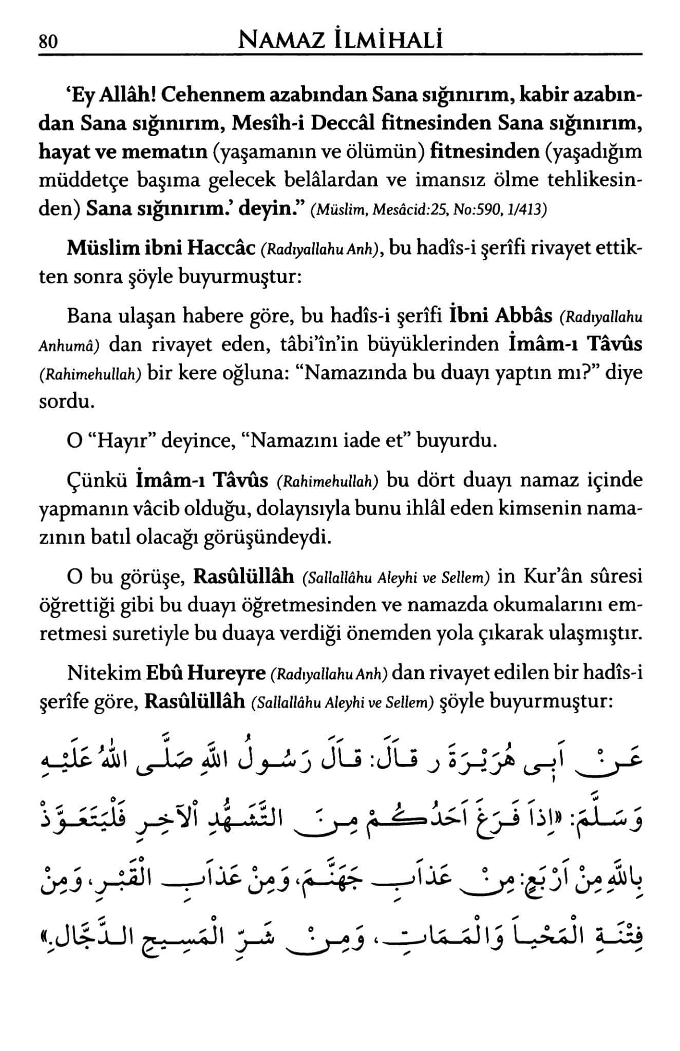 Allâhümme innî eûzü bike min azâbi cehennem. Ve eûzü bike min azâbil-qabr. Ve eûzü bike min fitnetil-mesîhid-deccâl. Ve eûzü bike min fitnetil-mahyâ vel-memât.