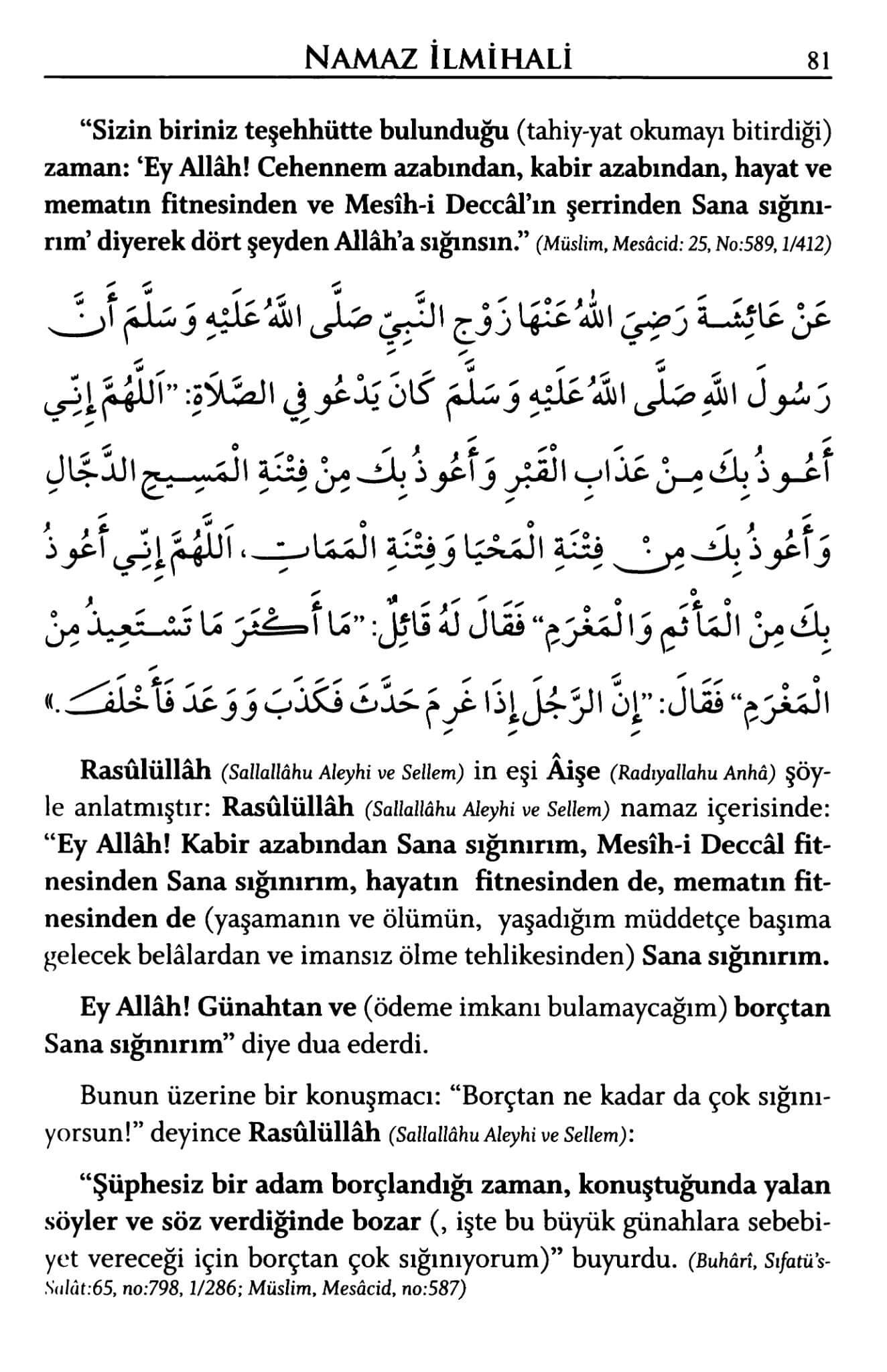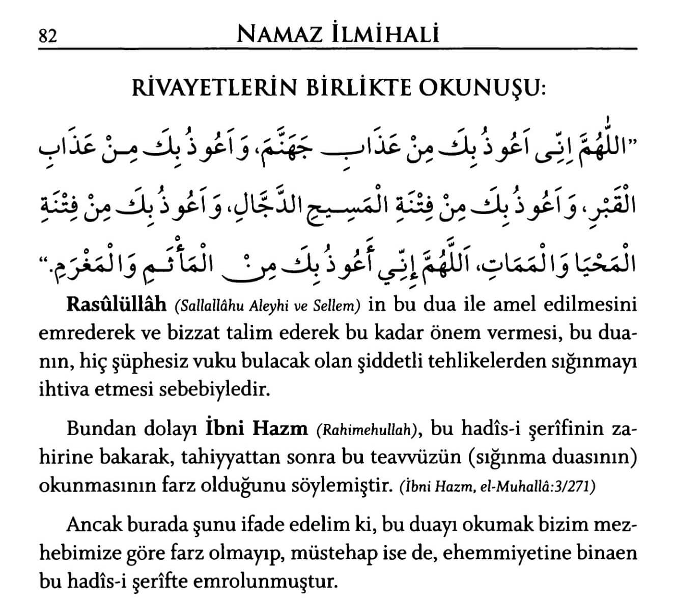 Allâhümme innî eûzü bike min azâbi cehennem. Ve eûzü bike min azâbil-qabr. Ve eûzü bike min fitnetil-mesîhid-deccâl. Ve eûzü bike min fitnetil-mahyâ vel-memât. Allâhümme innî eûzü bike minel-me'semi vel-mağram.