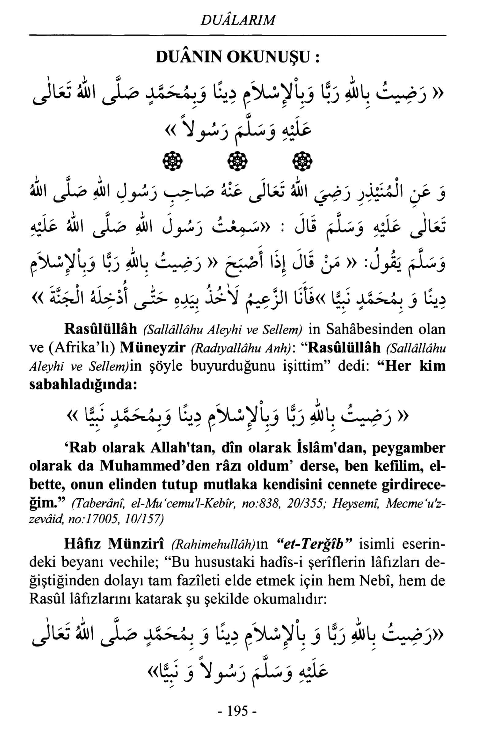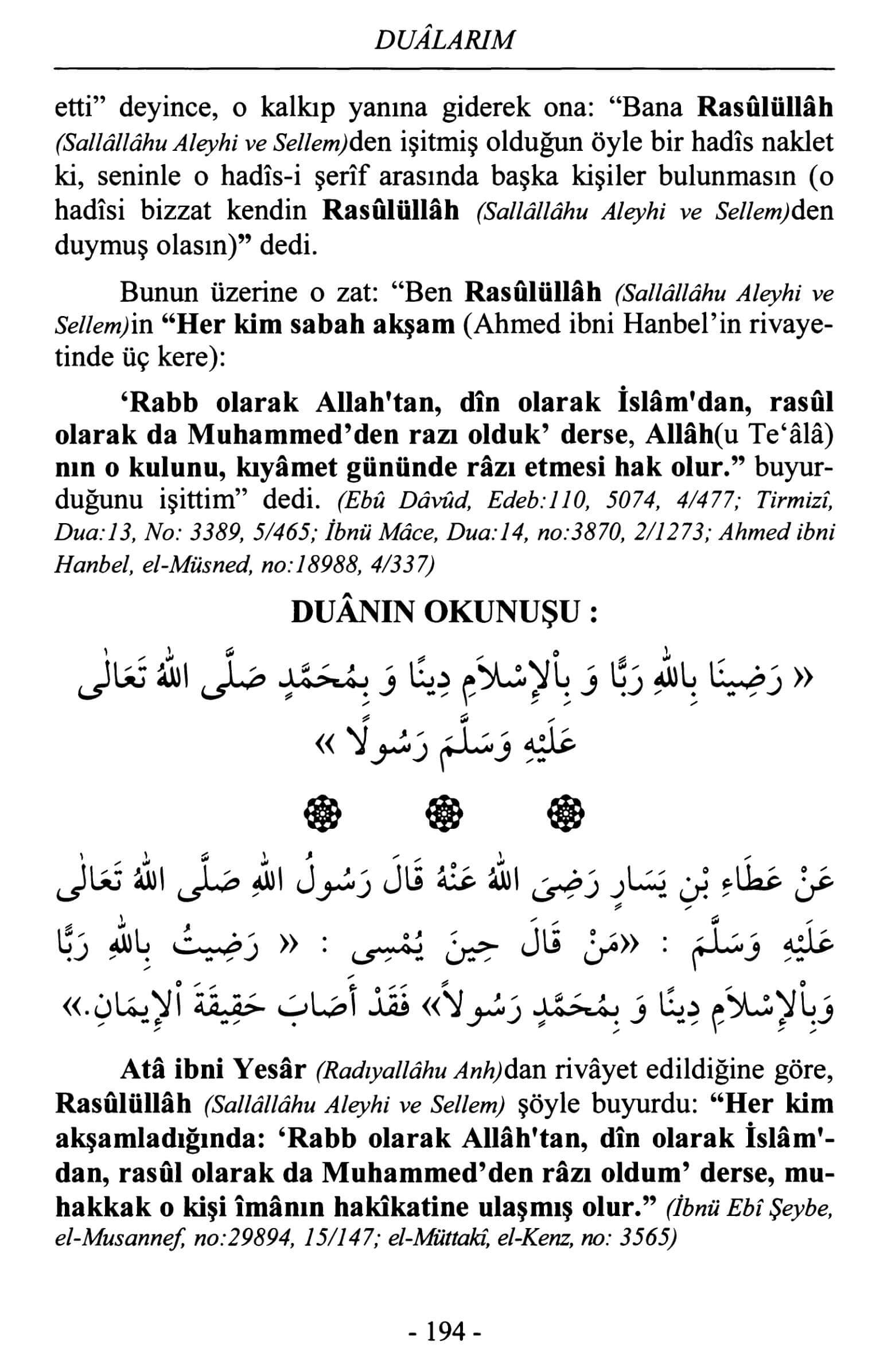 Radîtü billâhi rabbâ, ve bil islâmi dînâ, ve bi Muhammedin sallallâhu teâlâ aleyhi ve selleme rasûlen ve nebiyyâ.