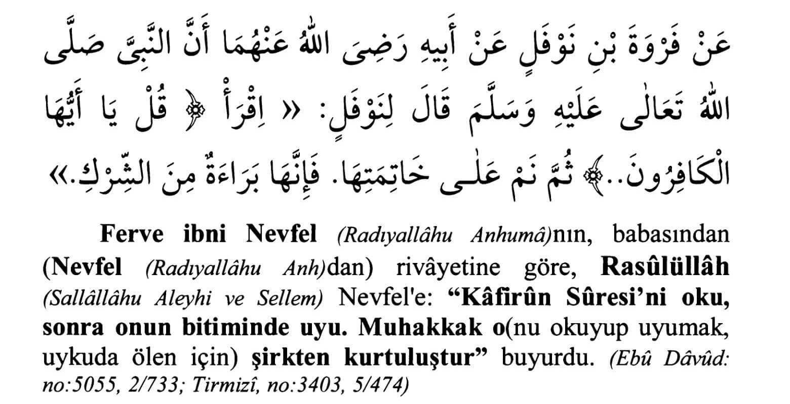 Uyumadan Önce Kâfirûn Suresi Okumak31 Ocak 2026Hüsn-ü HatimeUyumadan Önce Okunacaklar+1PaylaşPlayDualarımUykudan Uyanıştan İtibaren Yatıncaya Kadar Rasûlüllâh (Sallallâhu Aleyhi Ve Sellem)in Bir Gün Içinde Okuduğu Rivâyet Olunan, Dolayısıyla O'nun Ümmetinin Her Ferdinin Dualarım Diye Sahip Çıkarak Amel Etmesi Sünnet Olan Dua ve ZikirlerKitabı Satın AlDualarım, Sayfa 242